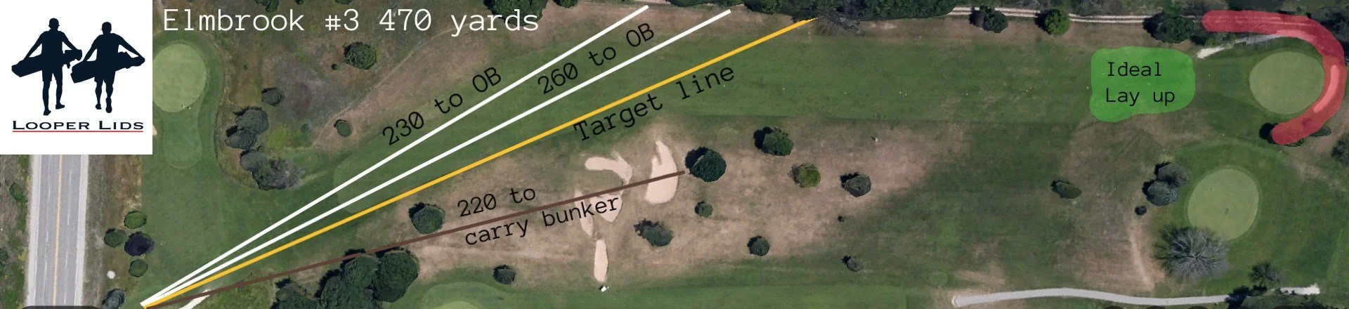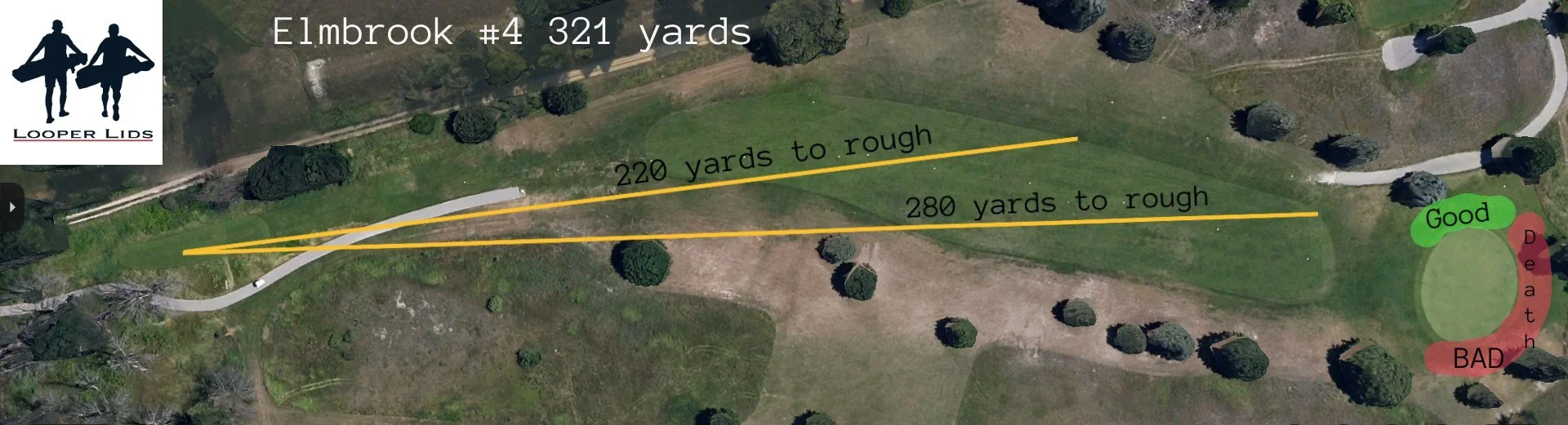 The par 5 3rd hole is well under 500 yards, but it’s no walk in the park. The tee shot feels awkward, with trouble lurking in every direction. The entire left side of the hole is bordered by a property line defined by out-of-bounds. As you can see from the overhead view, it doesn’t take much to find that out-of-bounds area. The target line is along the right rough (yellow), where the OB starts 290 yards from the tee.