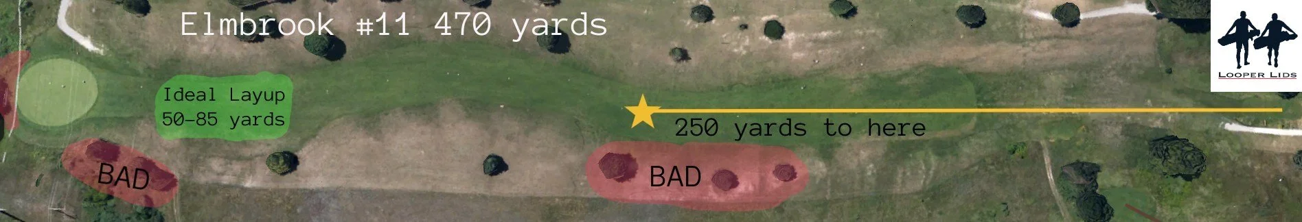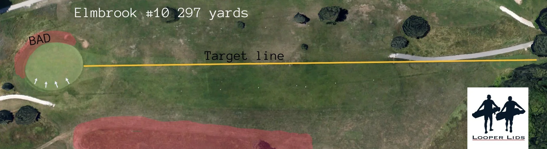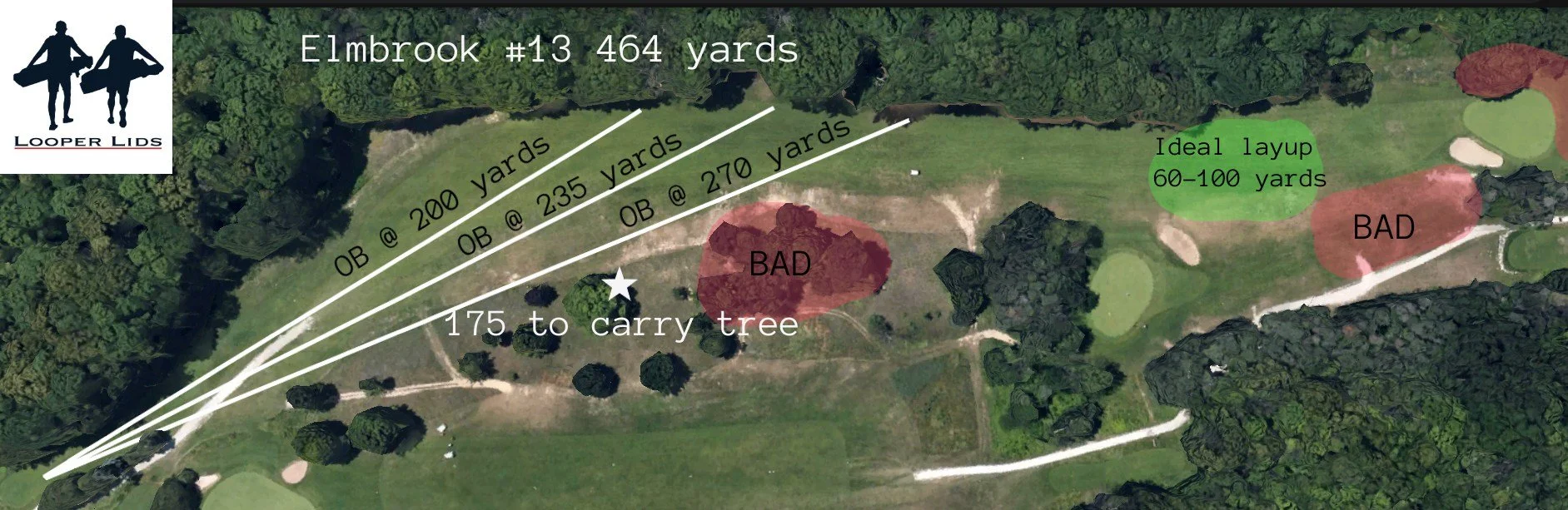 Personally, I tend to be a little more aggressive off the tee, but that’s because I hit a natural left-to-right shot with my 5 wood. I’ll aim for the middle OB line (around 235 yards) and let the shot shape take over. After breaking down the hole, though, I’m thinking about clubbing down to ensure I keep the ball in play.