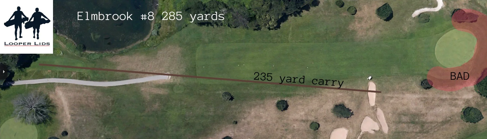Like many of the green complexes at Elmbrook, this one has a false front that denies any ball that doesn't clear it. The green slopes from the front left corner to the back left corner, which explains why golf balls often release forward on approach shots. The rough surrounding the back half of the green is elevated, stopping balls that roll through in a hurry. I’d recommend missing long rather than short, so I’d add at least 5 extra yards for the uphill approach. Aim for the left half of the green, as a slight miss left can kick right onto the green. The right side, however, elevates before falling off into some nasty grass—definitely avoid missing right.