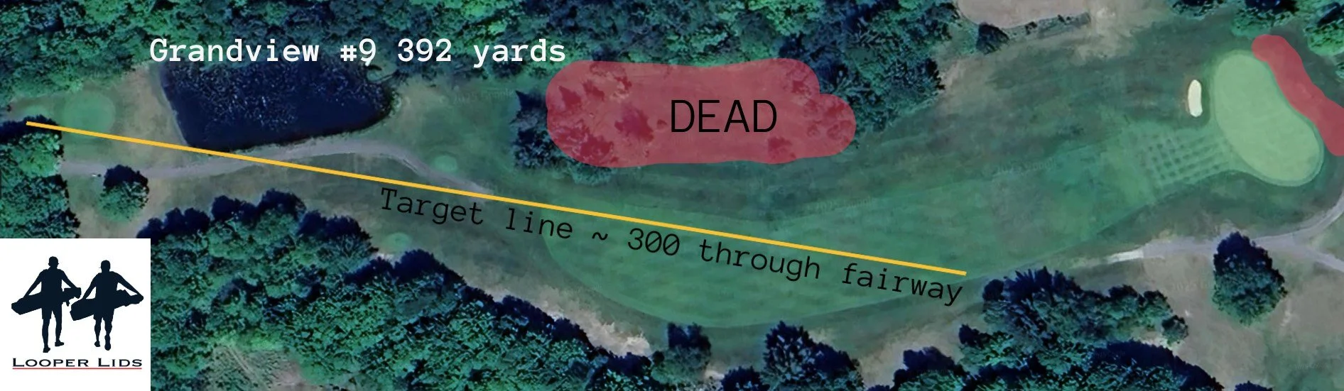 One of my favorite holes at Grandview, the par 4 9th is a great dogleg-left hole that deceives you into aiming too far left off the tee. The hillside to the right of the cart path hides the right half of the fairway from golfers. Your aim off the tee should be right over the last part of the cart path.