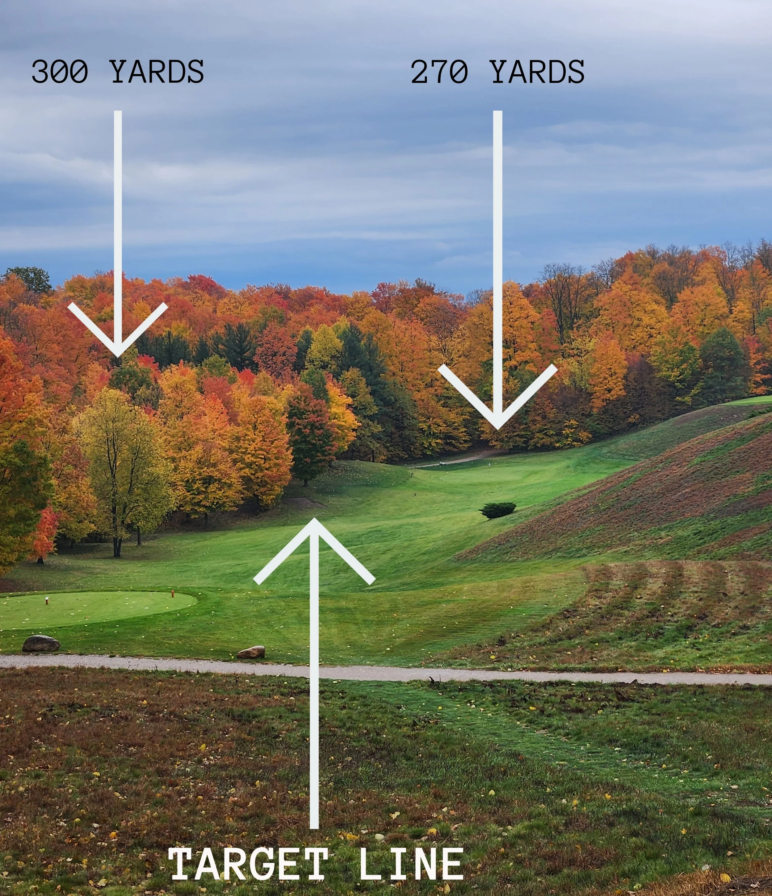 The major disguise on this hole is how forgiving the left side of the fairway actually is. Props to Mike Devries on this one, because most golfers will look from the tee and instantly think they should favor the right side, given the dramatic right-to-left slope. Your brain will automatically say, "aim right." There’s a bush up the right side that would make a perfect target line, giving your intuition confirmation bias. That bush, however, is actually 270 yards out from the tee box, and most golfers can only dream of reaching it.