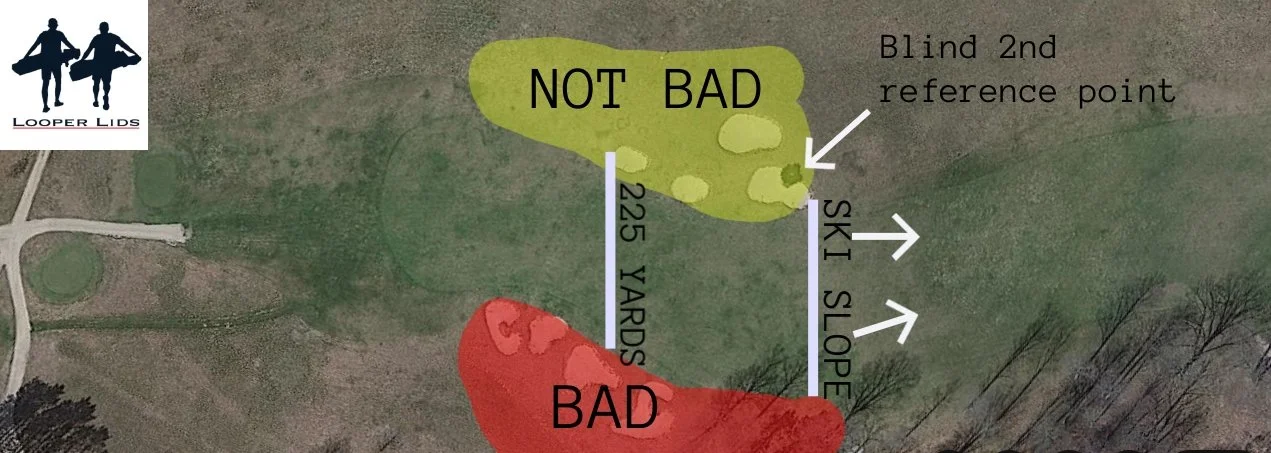 A miss left puts you in the left bunkers, but at least you’ll have a good angle to advance the ball up the fairway. This area used to be fairway, but that was a long time ago, and now the native grass is thick. If your ball is sailing left, make sure to pick a good reference point that your ball was flying toward. It’s very easy to get lost over here, especially if the ball disappears over the downhill. If you can't see where you're needing to hit your second shot from the left side, use the bush above the last bunker as a reference point. Generally speaking, if you're short of the first two left bunkers, your aim should be directly over this spot.